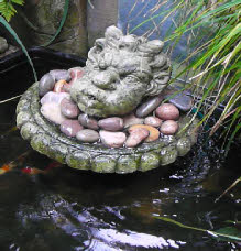 The stone head of a classical Roman figure sits on a stone pedestal alongside the pond.